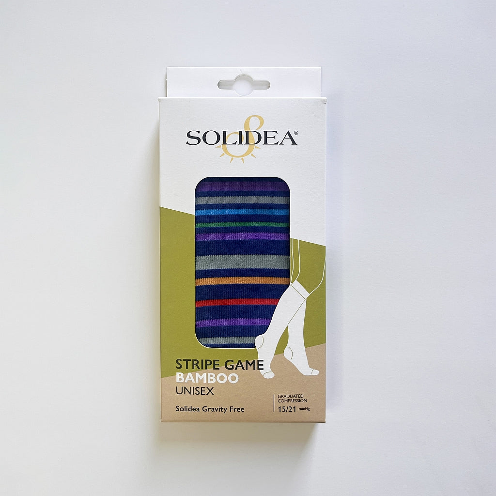 Solidea Strip Game Unisex knästrumpor med graderad kompression 15/21 mmHg kombinerar hälsa och stil. Tack vare mjuk bambutråd förbättrar de cirkulationen, lindrar svullnad och förebygger åderbråck, ödem och lymfödem. Perfekta för både vardag och resor – komfort, funktion och mode i ett.