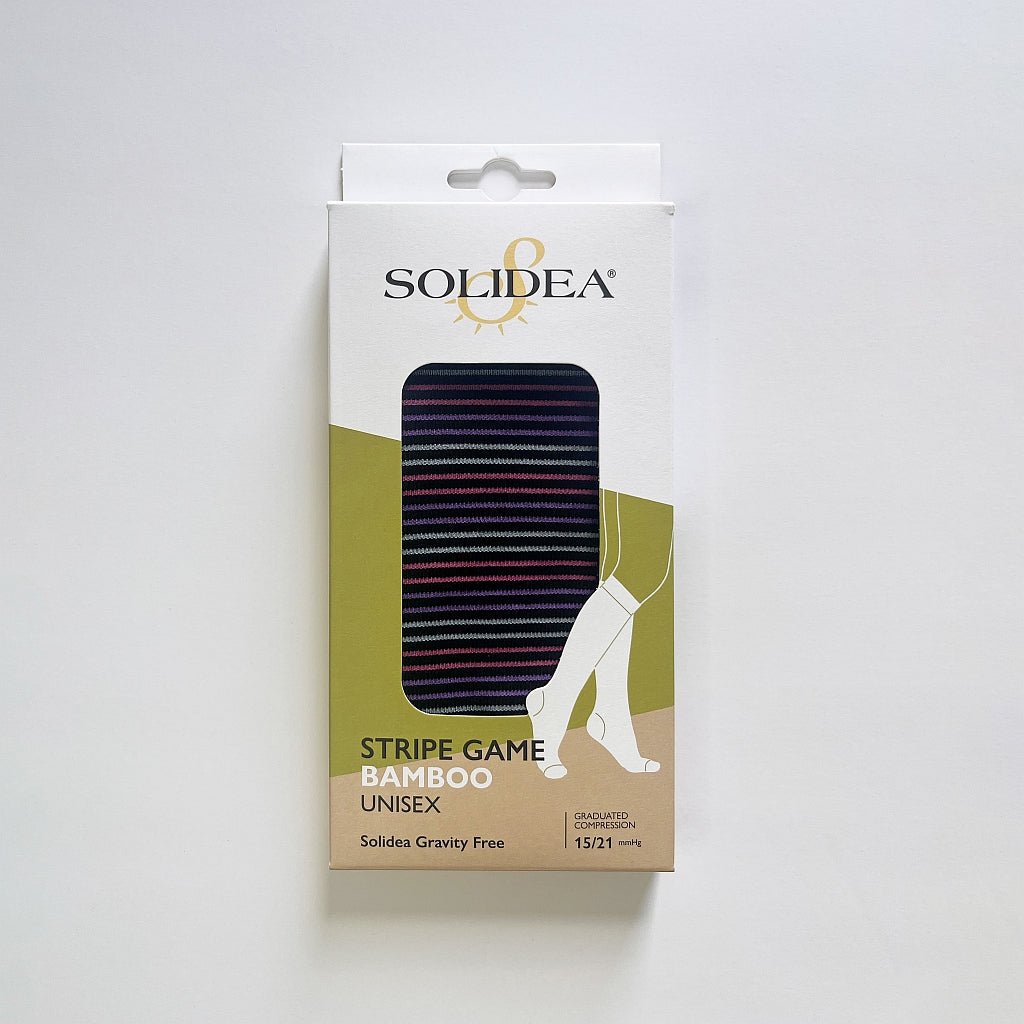 Solidea Strip Game Unisex knästrumpor med graderad kompression 15/21 mmHg kombinerar hälsa och stil. Tack vare mjuk bambutråd förbättrar de cirkulationen, lindrar svullnad och förebygger åderbråck, ödem och lymfödem. Perfekta för både vardag och resor – komfort, funktion och mode i ett.