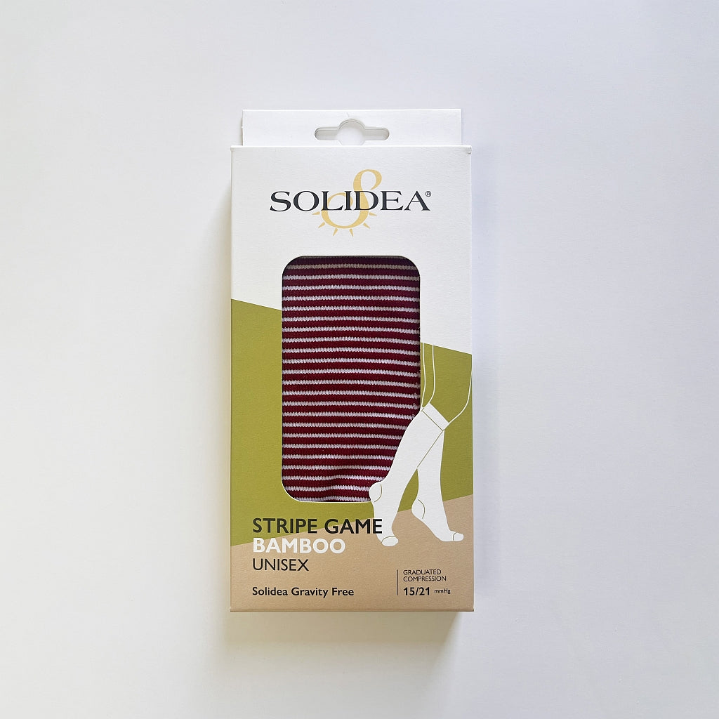 Solidea Strip Game Unisex knästrumpor med graderad kompression 15/21 mmHg kombinerar hälsa och stil. Tack vare mjuk bambutråd förbättrar de cirkulationen, lindrar svullnad och förebygger åderbråck, ödem och lymfödem. Perfekta för både vardag och resor – komfort, funktion och mode i ett.
