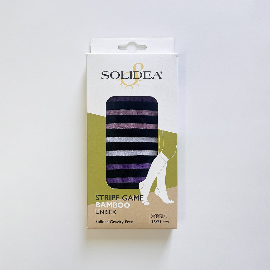 Solidea Strip Game Unisex knästrumpor med graderad kompression 15/21 mmHg kombinerar hälsa och stil. Tack vare mjuk bambutråd förbättrar de cirkulationen, lindrar svullnad och förebygger åderbråck, ödem och lymfödem. Perfekta för både vardag och resor – komfort, funktion och mode i ett.